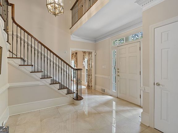 This elegant gated estate rests on 2.23 manicured acres in the heart of Sandy Springs, offering exceptional privacy, architectural sophistication, and an abundance of living space both inside and out. A long, landscaped driveway leads to a grand brick facade with classic columns. The grand double doors welcome you into a breathtaking two-story foyer featuring polished marble floors and a sweeping staircase. To the left, the formal living room invites conversation with its fireplace and abundant natural light, while across the foyer the formal dining room exudes elegance with marble flooring and a mirrored feature wall. The richly paneled den, accented by coffered ceilings and a fireplace, offers a warm and refined space for quiet reading or intimate gatherings. Nearby, a solarium with floor-to-ceiling windows and an antique fountain opens into an expansive media and entertainment room, complete with built-in cabinetry, a retractable awning, surround sound, and dramatic Palladian-style windows that flood the space with light. The heart of the home lies in the gourmet kitchen, with white custom cabinetry, porcelain tile flooring, stainless steel appliances including a built-in steamer, tile backsplash, and off-white Corian countertops. A spacious breakfast room and adjacent sunroom provide stunning views of the backyard, creating a peaceful setting for daily living. The main level also features a large primary suite with dual oversized closets and a private en suite bath, ideal for guests. Upstairs, the luxurious secondary primary suite is a true retreat, highlighted by a lighted double tray ceiling, spa-inspired bath with dual vanities, a jacuzzi tub, and a custom-designed oversized closet. Additional upstairs bedrooms are generously sized and share well-appointed baths, offering comfort and privacy for family and guests. The finished terrace level expands the home's living space with a versatile layout that includes a home office, a full bath, a wet bar, a game area, and direct access to a covered patio. Just off the terrace level, there's ample space to add a custom pool, allowing seamless indoor-outdoor entertaining. On the opposite side of the storage building, there's room for a tennis court or handball court, adding even more recreational possibilities to the estate. Several levels throughout the home and grounds can comfortably host mixed indoor-outdoor gatherings of over 100 people, making it ideal for entertaining on a grand scale. The grounds are equally impressive, featuring brick paver pathways, manicured lawns, classical statues, multiple fountains, and a built-in gas grill-perfect for al fresco entertaining. The guest house features its own three-car garage, providing private accommodations that include a living space with a kitchen, a full bathroom, and a bedroom. This arrangement increases the total garage capacity to five cars. This one-of-a-kind estate offers timeless craftsmanship, thoughtful updates, and premier amenities in one of Sandy Springs' most sought-after neighborhoods.