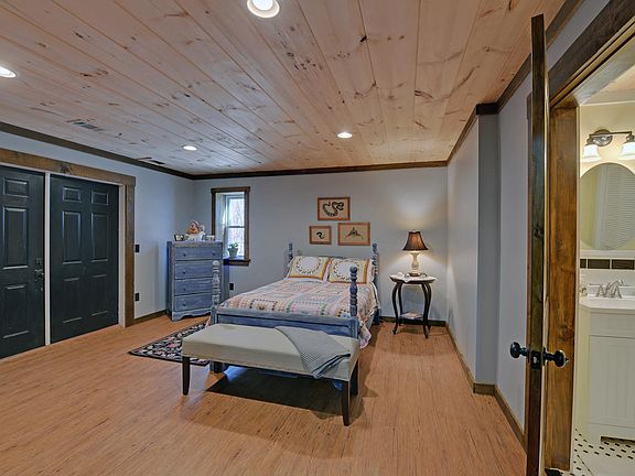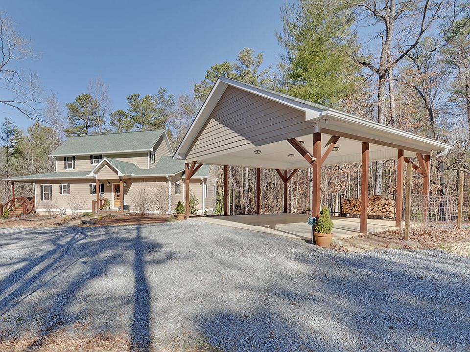 Farmhouse inspired country cottage nestled on 7 plus private acres with seasonal mountain view, babbling creek, walking trails, detached carport and a big red barn! Enjoy the cool evening breeze on the wrap around porch or cozy up to the hearth in the great room. Kitchen/dining area is open and perfect for family functions and entertaining. Laundry room/mud room is adjacent to kitchen and Master suite is on the main level with two bedrooms and a bath up and a fourth bedroom/bath on terrace level with another living area and plenty of storage. Barn has a large room upstairs which is perfect for crafts or storage area. This is a dream property with paved road frontage and lots of privacy without isolation. Great location off Clear Creek Road.