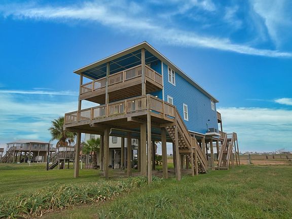 The home is well-situated near City Hall, historic Fort Velasco, Jetty Park, the Surfside Jetty, and the pedestrian beach. Three decks provide sweeping bay views and outdoor enjoyment. Built on pilings with electrical outlets, the structure is finished in durable cement board siding.