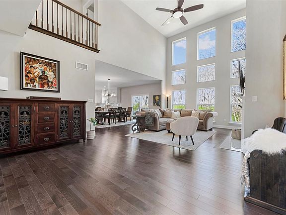 This spectacular McBride-built 1.5 Sty features best-in-class upgrades, fixtures & amenities including soaring ceilings, contemporary lighting & wide plank hickory flooring that extends throughout the main floor. Located in the premier Chesterfield community of Fienup Farms. Impressive 2-sty entry foyer leads to formal living room, striking great room with Carrara marble fireplace & dramatic wall of windows with private wooded views and adjacent dining room with quartz bar & sliding glass door that opens to deck. Culinary enthusiasts will love the designer kitchen with quartz countertops, transom cabinets, stainless steel appliances & 8’ center island. Spacious primary bedroom suite with wide bay window & luxury bath with freestanding tub & walk-in shower offers an appealing retreat. The 2nd floor extends the living quarters with 3 additional bedrooms, 1 with ensuite bath, & 2 with Jack n’ Jill bath. Situated on a premium cul-de-sac lot with deck, stamped concrete patio & 3-car garage.