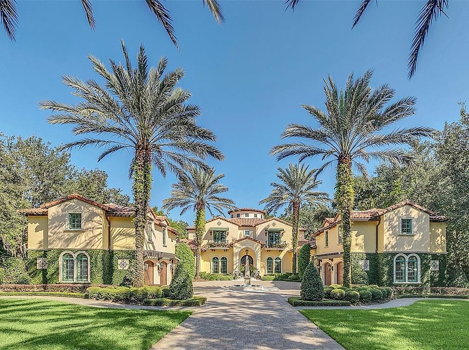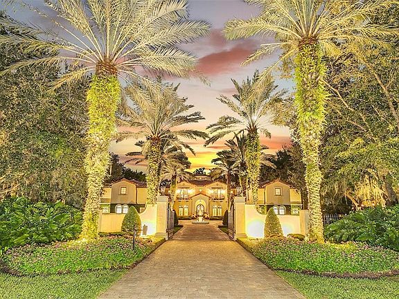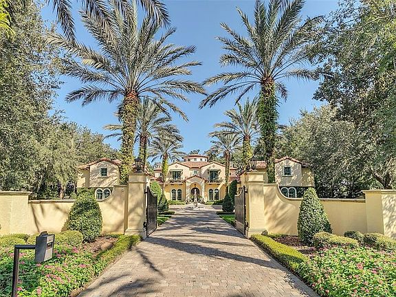 In the exclusive community of Windsong on Lake Berry, this magnificent 1.6-acre gated Mediterranean estate is a private oasis. With over 11,000 square feet of living area and a beautifully landscaped lakefront lot, this residence offers an exceptional blend of elegance, charm and privacy rarely found in Winter Park. The home features seven spacious bedrooms and nine full and two half baths. Entertain in the all-glass conservatory, dedicated theater room with motorized seating and a fully equipped game room. Modern conveniences throughout including gas-powered generators, an elevator and dumbwaiter. Two above-garage apartments provide ideal accommodations for guests and family. Outdoors, enjoy an expansive covered lanai, infinity edge pool and spa, boat dock with jet ski lift, and a summer kitchen complete with wood-burning fireplace, gas grill, refrigerator and icemaker, all overlooking the beautifully landscaped yard and lake. With its private gated entrance, this home is a one-of-a-kind opportunity to enjoy all the amenities Winter Park and Windsong have to offer.