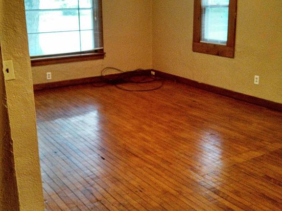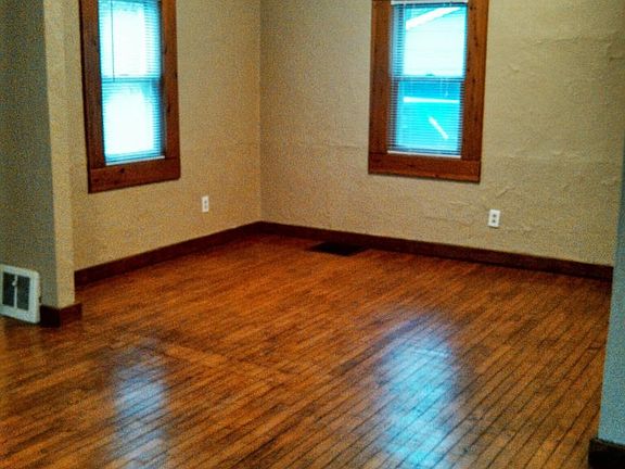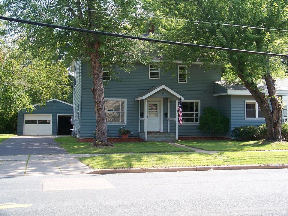 Unit is the main floor of a duplex; dining and living room have beautiful original hardwood flooring; two bedrooms, one of which is a "walk through" just off the kitchen which then opens into a hallway with bathroom and second bedroom access. Entry from the back of the home provides large mud room with lots of storage; detached garages provides space for one vehicle, also space outside of garage for second car. Rent includes water/sewer, heat, lawn care, snow removal, trash and covered garage space.