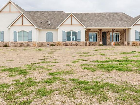 Breathtaking newer construction on over 5 acres of peaceful, country bliss in north Yukon- right across from Express Ranch. Custom build by Crabtree Homes in 2021, this home is truly stunning with so many upgrades including custom window treatments, expanded driveway & windblock + fireplace added to the covered porch. Sunrises & sunsets are on full display here! 10 ft ceilings allow for impressive entrance to a light + bright open floor plan. Gas fireplace & built-ins are the focal point of the living space. A spacious dining area flows into the most gorgeous kitchen imaginable- large island, endless cabinet space, gas range - pure perfection. Master suite coupled with tranquil bath-double vanity, linen closet, stand alone tub + shower & walk-in closet, connecting to spacious laundry room. French doors lead to bedroom or office/study -with 2 closets & amazing built-in display across the hall. Secondary rooms share full bath w/ double sinks