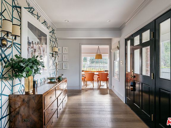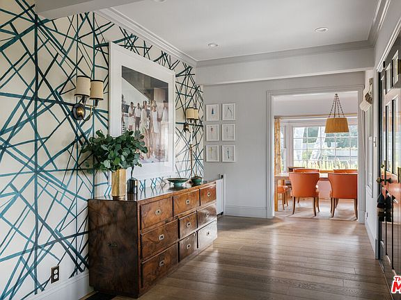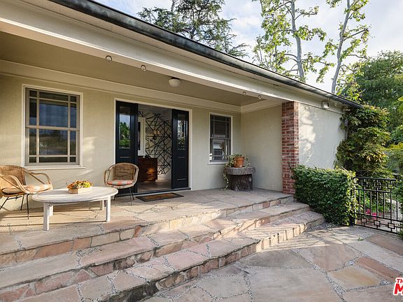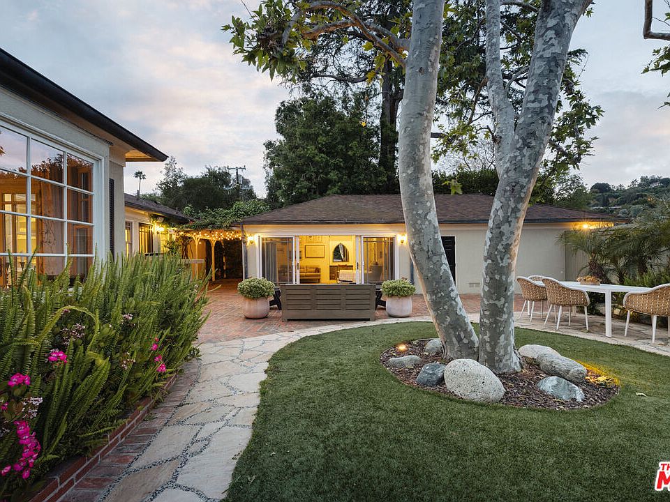 Picture perfect Traditional hideaway nestled on an elevated promontory in the Studio City Hills with views of the city and mountains beyond. Featured in Architectural Digest, this gorgeous home has been thoughtfully redesigned and beautifully renovated with carefully curated finishes. Completely hedged and fenced, the home has several entrance points, including a formal foyer and a casual kitchen side entrance for daily use, all surrounded by multiple patios, decks, rolling lawns, and blooming layers of mature landscaping. The main house has a formal living room with fireplace and views of the valley and a formal dining room, both with French doors leading outside. Eat-in kitchen with ample storage, custom cabinetry, laundry, and built-in bar that feels like your own speakeasy closet. Two suites with renovated baths in the main house and a powder room. The spacious primary suite has its own en-suite spa quality bath and walk-in closet. It also opens out onto a covered deck with an outdoor fireplace. Off the patio with firepit and built-in BBQ, is also a studio with its own bath, vaulted ceilings, and Murphy bed, perfect for an office or guests. Additional garage space with direct access to the patio behind gates for security. There are also solar panels, hardwood floors throughout, alarm security, and many other upgrades. Located moments from Ventura Blvd, the 101 and 134 freeways yet quietly tucked away from it all.