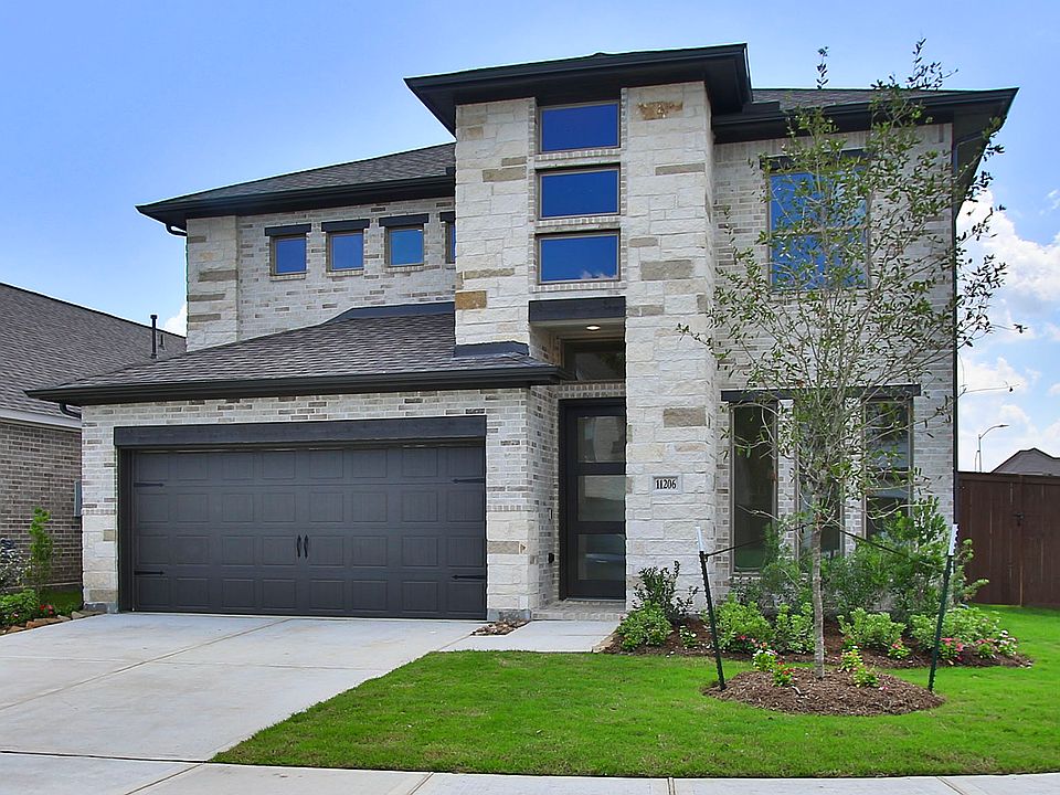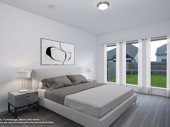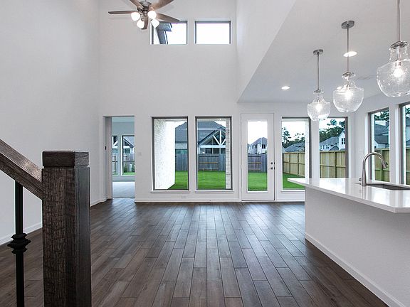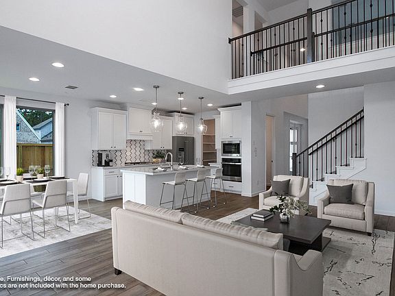 Home office with French doors set at two-story entry. Two-story family room opens to kitchen and morning area. Kitchen features large walk-in pantry and generous island with built-in seating space. Family room features wall of windows. First-floor primary suite includes bedroom with wall of windows. Dual sinks, garden tub, separate glass-enclosed shower and large walk-in closet in primary bath. Game room and all secondary bedrooms are upstairs. Extended covered backyard patio. Two-car garage. Representative Images. Features and specifications may vary by community.