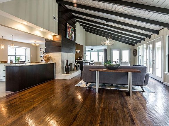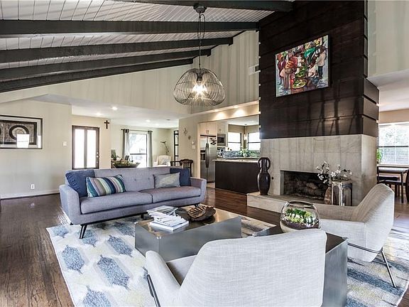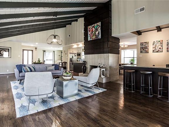 Mid-Century Modern Gem! Over-sized Living w-vaulted ceilings & wood burning fireplace. A third living area could serve as an office or formal dining room. Hardwood floors throughout. Stainless steel appliances, granite countertops, glass tile back-splash, serving islands, separate wet bar. Recessed lighting. Split bedrooms. Guest bedrooms with Jack and Jill Bath. Master w-vaulted ceilings, has own exterior exit to courtyard. Master bath features separate shower, soaking tub, separate vanities & walk in closets. Fantastic outdoor area with pool, pergola and covered patio.