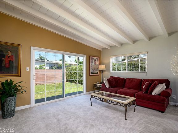 Step inside to discover a spacious living room with stunning 10-foot vaulted wood ceilings, large windows & sliding doors that flood the space with natural light, crown molding, and recessed lighting. The open-concept layout is perfect for entertaining, with a beautifully updated kitchen featuring quartz countertops, a gas range, and a spacious dining area that flows seamlessly into the living room.