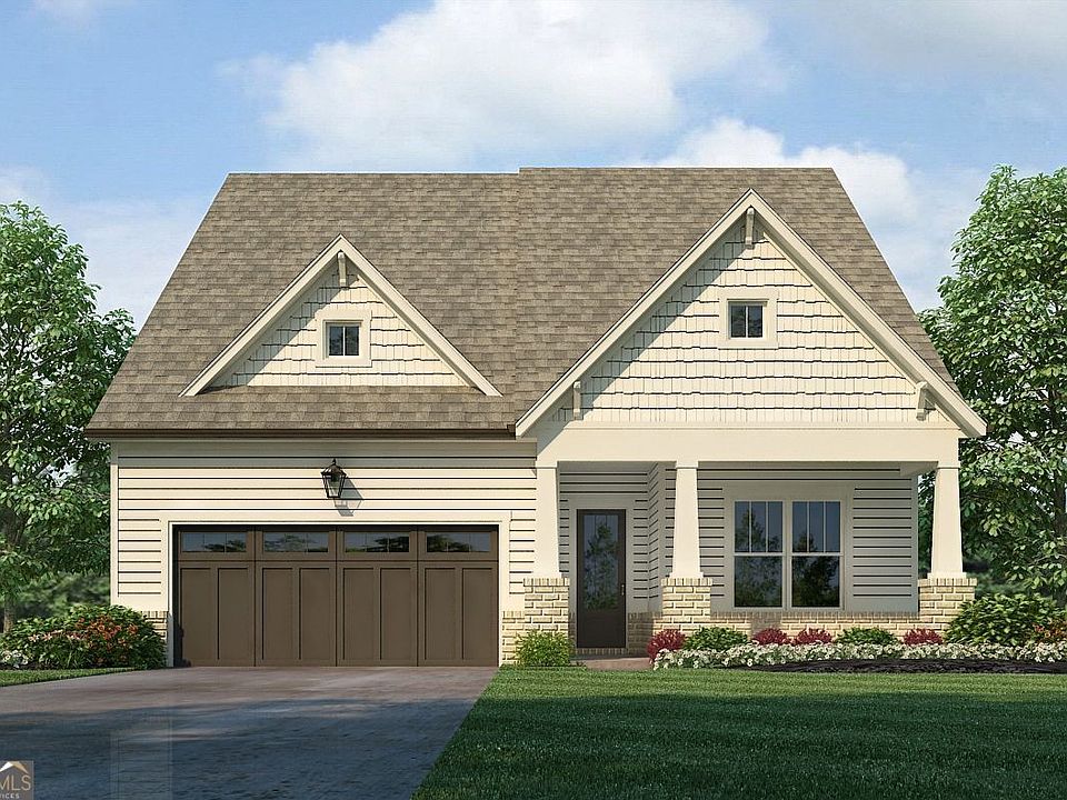 Welcome to the luxurious Oakwood floor plan. This true ranch plan features a bright, open gourmet kitchen w/ a grand island. Stainless steel appliance package includes oversized cooktop and oven. Beautifully designed cabinets and countertops throughout. The spacious owner suite and twos secondary bedrooms are conveniently located on the main floor. Owners' suite comes fit with a stunning double vanity, large zero-entry designer tile shower, and incredible tile flooring. Convenient features of the home include hardwood flooring throughout, oversized entry ways, high ceilings, cabinet microwave, oversized covered patio, rocking chair front porch, covered back patio luxurious lighting package, easy access floor plan, HOA maintained landscaping, and Weekly trash pick-up. All located on a beautifully landscaped private cul-de-sac lot. You will love this gated, low-maintenance, active adult community, located close to sought after downtown Woodstock, and nearby Towne Lake, with ideal shopping and dining. Model Homes Hours: 11-5 and 1-5 on Sunday, appointment only Wednesday and Thursdays and Home is under construction with a completion date December 2025