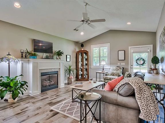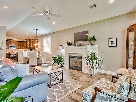 Cozy fireplaceBeautiful sage accent wallMarble countertopsHardwood tile floorsVaulted ceilingGas tankless water heaterImpact-rated windows