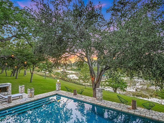 This is the one you've been waiting for. Tucked away at the end of a quiet riverside road, this one-of-a-kind estate feels like your own private paradise on the water. With two acres shaded by mature trees, 200 feet of Blanco River frontage, and ranch land on two sides, it’s the kind of place made for slowing down and making memories. Perfect for gathering with loved ones or savoring a quiet evening on the river, this waterfront home is designed to be enjoyed for generations. The property includes a main home and a charming guest bunkhouse, so there’s plenty of room for family and friends. Out back, the deep limestone pool and spa overlook the river, with a handcrafted outdoor fireplace, perfect for cool nights. Or you can wander down the grassy slope and sit in the water while the sun sets. Inside the main home, you’ll find a cozy stone fireplace, a modern kitchen with top-of-the-line appliances, and a wet bar that makes entertaining a breeze. Each of the three bedrooms has its own bathroom, and there’s a powder room near the living area for guests. The laundry doubles as a butler’s pantry with a second fridge — a small detail that makes a big difference. The bunkhouse next door is its own little getaway with a stone fireplace, projector, rec room, sleeping area, bathroom, and covered porch. Plus plenty of outdoor fun with horseshoes and washers. Additional amenities include a basketball court, swing set, garden, and an oversized fire pit ready for long nights under the stars. Here, there are endless ways to enjoy the outdoors year-round. This is a home built to enjoy — whether you’re sitting in the river, soaking in the pool, hosting a dinner party, or just curled up by one of the many fireplaces. Once you’re here, you won’t want to leave.