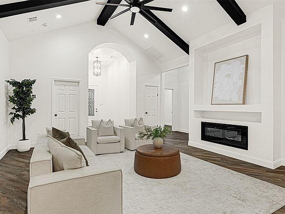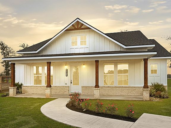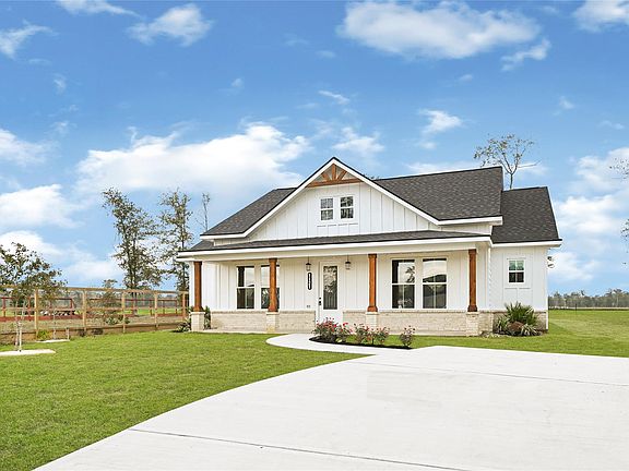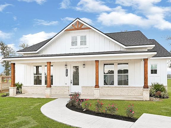 A true must-see Modern Farmhouse with exceptional details throughout! Featuring 4 spacious bedrooms and 2.5 bathrooms. Step inside to soaring cathedral ceilings that fill the home with natural light and complement the beautiful wood accents and cozy chimney. The chef-inspired kitchen offers custom cabinetry, a charming farmhouse sink, a large center island, expansive counter space, and a walk-in pantry. The efficient split-floorplan provides privacy for all bedrooms, each offering generous closet space. The luxurious primary suite includes a spa-like bathroom with a soaking tub, an oversized walk-in shower, and a double-sink vanity. The laundry room is thoughtfully designed with custom cabinetry and a utility sink for added convenience. Enjoy outdoor living with a spacious front porch and a large covered back patio. This home offers no carpet, a low tax rate, no back neighbors, an extensive driveway that provides ample parking and is not located in a flood zone. This is a must see.