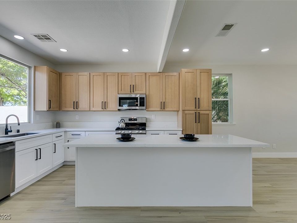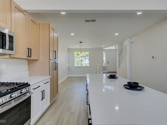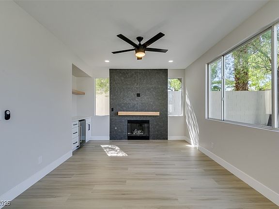 Quartz countertopsTwo toned shaker cabinetsNatural lightStainless steel appliancesOpen concept floor planAccented fireplace tileCeiling fans