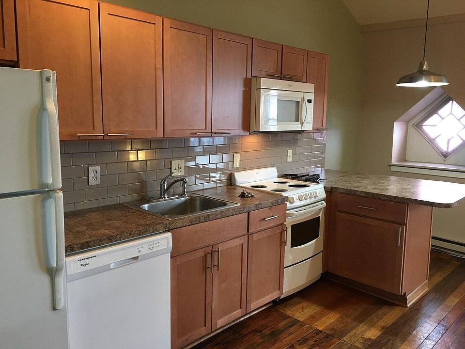 Medium sized Penthouse w/ vaulted ceilings an funky little Loft space above the Bedroom, accessed by a built in ladder, its a cool little bonus of space. Open concept w/ New Kitchen, snack bar, DW, built in microwave/vent, Hardwood, stained glass, bay window, exposed brick, and exposed wood structure. Shared FREE laundry in Basement, Street parking, permit available thru APA. Electric for Heat, Hot water, cooking, power and lights by resident. Garbage, Water and Sewage by owner. Building is owned and managed by local and responsive - TFD rental properties. Typical application, years lease, employment verification. Deposit is 2 months, but you can get into the space w/ the first months rent, half the deposit and take 6 weeks to come up w/ the balance of the deposit. We look for rent to be approx 28% of your gross monthly income. Not set up for Section 8...