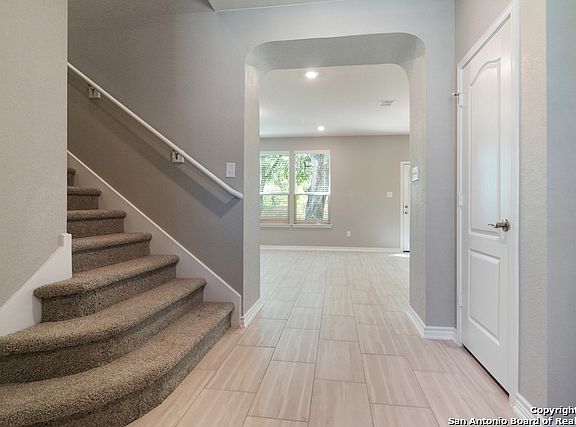 This two-story home has a beautiful 8-ft. stained entry door and features loads of upgrades. Emser tile flooring extends from the entry into the living room and kitchen. Enjoy cooking in a kitchen with 42-in. Woodmont Cabinetry Shaker-style upper cabinets, Aspen White granite countertops, glossy tile backsplash, a Moen Arbor high arc faucet, and a Whirlpool gas range, wall mount canopy hood, and 5-cycle dishwasher. The private master bedroom has double doors, and the master bath boasts a raised vanity, a walk-in shower with tile surround, a Moen ceiling showerhead, and a Moen Magnetix handheld showerhead. The secondary bath has a porcelain tub/shower with tile surround and Moen Align bath accessories. Additional features include a wireless security system, dimensional roof shingles, a full yard sprinkler system, a soft water loop, upgraded Sherwin-Williams interior paint, and 2-in. faux wood blinds. Please call for more information.