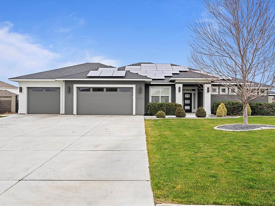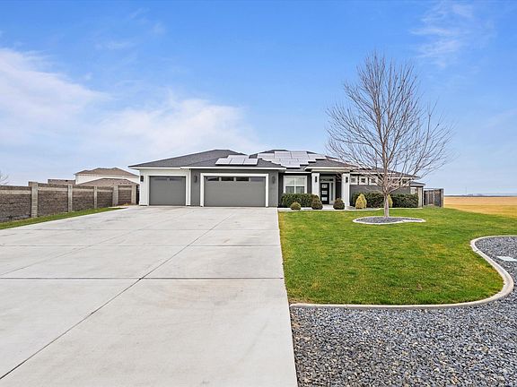 MLS# 289916 Welcome to your dream home! This stunning 2668 SQF rambler, featuring the highly desirable Encore split bedroom floor-plan by Prodigy Builder, a true gem nestled in a peaceful cul-de-sac on a 0.54-acre lot. NO HOA. With 4 bedrooms and 3 bathrooms, this modern and contemporary residence offers spacious living designed for comfort and style.Step inside to discover a beautiful kitchen that is truly the heart of the home, boasting a huge island perfect along with plenty of cabinets for ample storage. You will love spacious walk in pantry. The expansive living room is a highlight of this home, featuring large picture windows that flood the space with natural light.Imagine cozy evenings by the fireplace, where you can enjoy the warmth and ambiance while taking in views of your stunning heated pool right from your living area. The open concept layout enhances the feeling of spaciousness and connection The home is equipped with a built-in surround sound system, enhancing your entertainment experience. Each bedroom has its own walk-in closet, providing ample storage.The master suite is a private oasis featuring walk-in shower and tub combo, dual vanity & generously sized walk in closet.You will love floor to ceiling tiled enormous shower with double shower heads, elegantly tiled to create a spa-like experience. Also, private master suite offers direct access to patio.Large laundry room has a sink & counter working space leading into huge walk in storage room. Outdoor living is just as impressive with a backyard that resembles a serene oasis.The heated fiberglass pool (16 x 40 ft) is complemented by an automatic cover for safety and energy efficiency, ideal for year-round enjoyment.Enjoy evenings around the outdoor fire-pit, with a built-in propane line dedicated for your convenience. The covered patio offers an ideal spot for relaxation or entertaining guests, all while taking in the breathtaking sunrises and sunsets this home offers.The property is fully fenced for privacy, enhanced by custom powder-coated gates.The 3-car garage and open RV parking space, combined with a huge and long driveway, provide plenty of room for vehicles and guests. A fully owned 11kW SOLAR system ensures net-zero living, offsetting your energy consumption and providing significant savings on utility bills. Conveniently located close to everything you need, this home perfectly blends luxury, convenience,& sustainability.Don't miss the opportunity to make it yours.