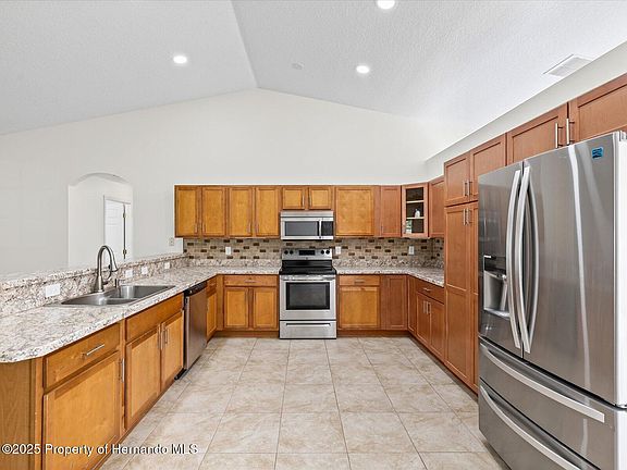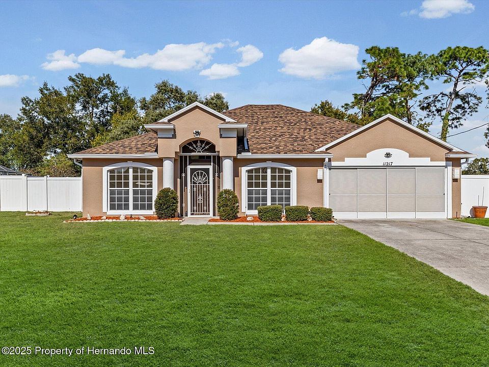 Move-in ready & beautifully updated, this 3 bedroom, 2 bath, 2 car garage Mercedes Homes built home located in the Heart of Spring Hill offers a practical layout, modern touches & valuable upgrades—including a BRAND NEW 2025 ROOF! Thoughtfully designed, the split-bedroom floor plan ensures privacy, while the formal living/dining rooms & cozy family room provide plenty of flexible living space for everyday comfort or entertaining. The inviting eat-in kitchen includes stainless steel appliances, ample cabinetry & a pantry with pullout shelves for added convenience. Beautiful tile flooring flows into luxury vinyl plank in the bedrooms, complemented by fresh interior paint for a bright and airy feel. The primary suite includes an updated bathroom, while the two additional bedrooms are ideal for guests, a home office, or seasonal stays. Enjoy the spacious enclosed back porch (2021), perfect for relaxing through Florida's mild winters, or hosting weekend barbecues. The fully fenced back yard offers privacy as well as safety for small children & pets. Centrally located near shopping, dining, parks, & local amenities, this home is an excellent choice for first-time buyers, seasonal residents, or anyone seeking low-maintenance living. Schedule your appointment to view this amazing home today! The front yard photo has been digitally retouched.