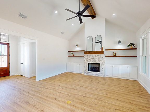 Welcome home to Bryce Circle. As you enter the home, the wide entryway will lead you to the open concept living room and kitchen. To the right of entry way through tall French doors is the bonus room. This space could be utilized as a formal dining room, office, study, classroom, etc. Living room has floating shelves and custom cabinets on either side of the gas brick fireplace. There is also access to the covered back patio and substantial backyard as this home sits on approximately 0.853 acres. Home features modern colors and light fixtures throughout. Kitchen has quartz flat edge eleganza carrera counter tops, gas oven/range, pot filler, white oak stained island with storage underneath, and is conveniently located by the breakfast nook, bonus space, and living room. Also located nearby is the extensive pantry, hall tree, and will lead to the laundry room. This laundry room has plenty of countertop space, cabinets, sink with window, and leads to the private en-suite bathroom of the primary bedroom. This private bathroom has separate vanities, walk-in closet, large soaking tub, separate tall shower, and a separate water closet. The primary bedroom has wood beams and is spacious and separate from the two additional bedrooms. On the other side of the home are the two bedrooms, and two and a half bathrooms. Every bedroom has a bathroom attached. All that is missing to make this house a home is YOU!