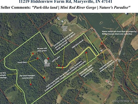140 Acres of Untouched Beauty in Clark County! This rare opportunity now includes a charming 2BD/2BA farmhouse along with a stunning mix of wooded and tillable land (approx. 25 acres). The property features miles of cut-in trails, Dry Branch Creek along the rear boundary, and the remainder in Classified Forest, managed under a DNR Timber Stand Improvement program with a logging contract in place—trees marked for removal and harvest to be completed by Fall 2026. An additional approx. 1000sqft. 1970s 1BD/1BA hunting log cabin with flex room. Both homes are tenant-occupied with electric, water, and laundry on site. Access is via private utility easement maintained by the seller (recorded in deed), surrounded by farmland, yet just 6 miles to Charlestown and under 15 miles to Jeffersonville/I-265. Wildlife abounds—deer, turkey, bobcat, fox, and owls—making this a true sportsman’s paradise. Ideal for recreation, conservation, farming, or establishing your private estate. Note: A 1-acre parcel will be surveyed off at corner and retained by the seller. Propane or electric only. Homes are tenant-occupied and will not be accessed until after an accepted purchase contract. Do not enter property without permission. Sq. Ft. of homes is approximate. Buyer to verify. Also listed as residential MLS #2025010947. Property is sold As-Is.