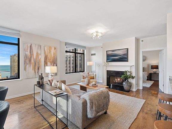 Sophisticated 3-Bedroom / 2.1-Bath "H" Tier Residence in Chicago's Prestigious Gold Coast. Set on picturesque, tree-lined Dearborn Street, this rare 3-bedroom, 2.1-bath home offers an elevated urban lifestyle in one of the Gold Coast's premier boutique buildings. Enjoy stunning Lake Michigan and city skyline views from an open-concept floor plan with a desirable split-bedroom layout, 9-foot ceilings, and a private 20' x 5' balcony. The expansive living and dining area features wrap-around windows, a fireplace, beautiful hardwood floors, and custom-designed lighting scheme. The stunning custom designed OBrian Harris kitchen boasts premium appliances, reverse osmosis water system with instahot a pantry, and abundant built-ins, making it perfect for both entertaining and everyday living. The primary suite captures lake views and includes a very large professionally organized walk-in closet and a luxurious en-suite bath custom designed by OBrian Harris. This spa-like retreat offers heated floors, a steam and rain shower, and extensive custom storage. A welcoming foyer with two large closets leads to a powder room, full-size side-by-side laundry with extra storage, and a bonus linen closet, completing this impeccably maintained home. Residents enjoy 24-hour door staff, on-site management, a fitness center, party room, and a rooftop deck with panoramic views. Steps from world-class dining, shopping, the farmer's market, and the lakefront, this home offers the very best of Gold Coast living. Additional storage and one prime garage parking space included.