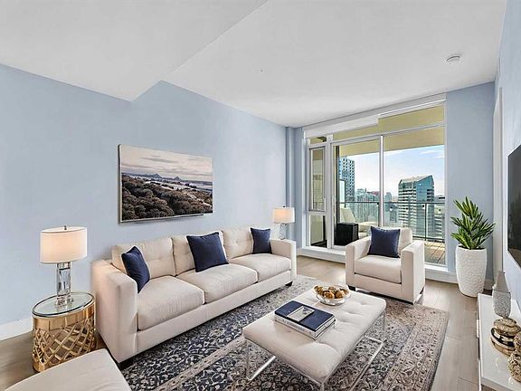 Open-concept layoutSleek laminate flooringFloor-to-ceiling windowsDesigner white cabinetryQuartz countertopsStainless steel appliancesCentral island