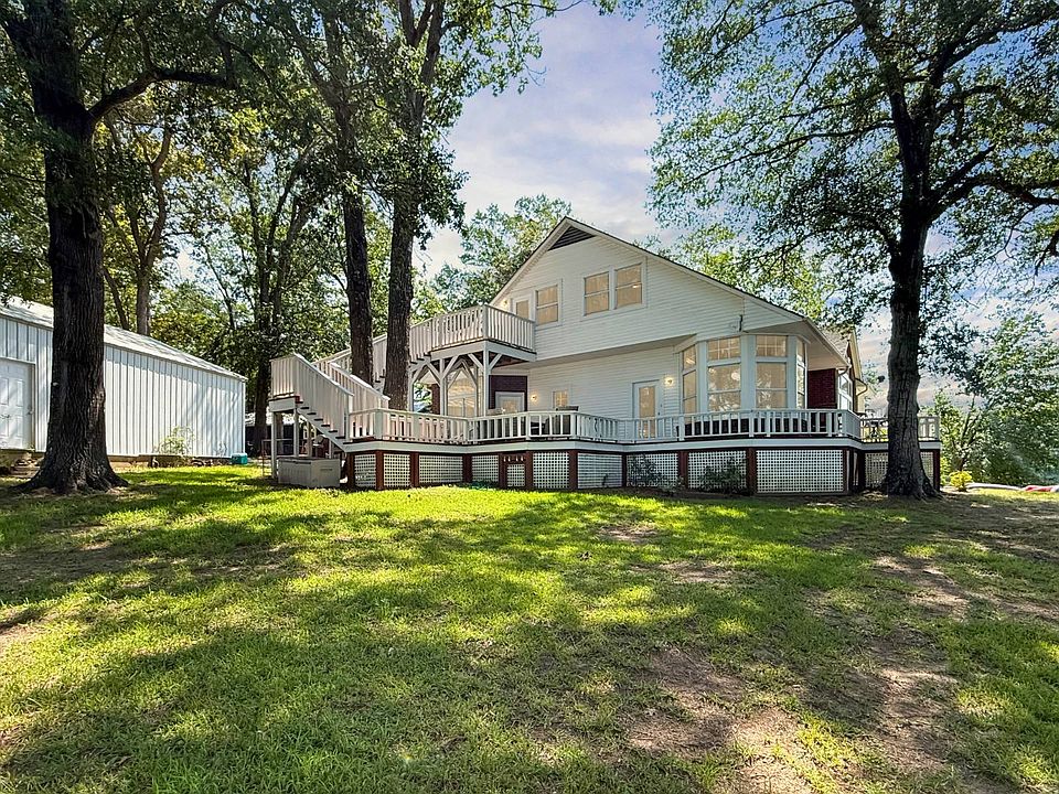 Welcome to Sandi's Point-a once-in-a-lifetime retreat at the tip of a private peninsula on Raymond Gary Lake. With water wrapping around nearly every angle, this property offers panoramic views, unmatched tranquility, and the kind of lakeside living most people only dream about. Inside, the home was designed with gatherings in mind. The spacious eat-in kitchen and dining area is the true heart of the home, offering room for everyone to come together around the table. Whether you're enjoying morning coffee with the sunrise over the water or hosting a fish fry with family and friends, this space flows beautifully into the oversized living room with floor-to-ceiling windows showcasing the lake from nearly every angle. With 5 bedrooms, 4 bathrooms, a sunroom, and an oversized upstairs hallway perfect for additional bunks or sleeping space, there is truly room for the whole family-and then some. Nearly every room in the house, except one, overlooks the lake, surrounding you with water views at every turn. Outdoor living is just as extraordinary. Wraparound decks extend from the kitchen, living room, primary suite, sunroom, and even an upstairs bedroom, giving you endless spots to relax or entertain. The shaded backyard is ideal for evening bonfires, cornhole tournaments, or lazy afternoons under the trees. Down by the water, your private boat slip with an expansive sitting deck invites fishing, boating, and lakeside entertaining in complete comfort. Additional amenities include: Detached 2-car garage for vehicles, storage, or lake toys Peaceful no-wake lake-perfect for fishing, kayaking, and swimming Roomy layout designed for hosting large groups with ease Not only is this home a personal paradise, it's also a profitable investment property. Currently operating successfully as a rental on Airbnb and VRBO, Sandi's Point offers buyers the ability to enjoy it as a primary or second home while continuing to generate income when not in use. Perfectly located just 2.5 hours from Dallas, 45 minutes from Broken Bow, 25 minutes from the Choctaw Casino, and 20 minutes from Hugo, this retreat combines accessibility with total seclusion. Whether you're looking for a vacation escape, a multi-generational gathering place, or your own private slice of paradise, 2211 Peninsula Dr at Sandi's Point is a property that simply cannot be replicated.