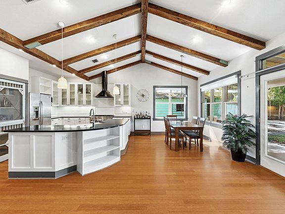 Freestanding wood fireplaceCathedral beamed ceilingsQuartz countertopsSpa-like retreatCurved islandStand-alone soaking tubFruit and pecan trees