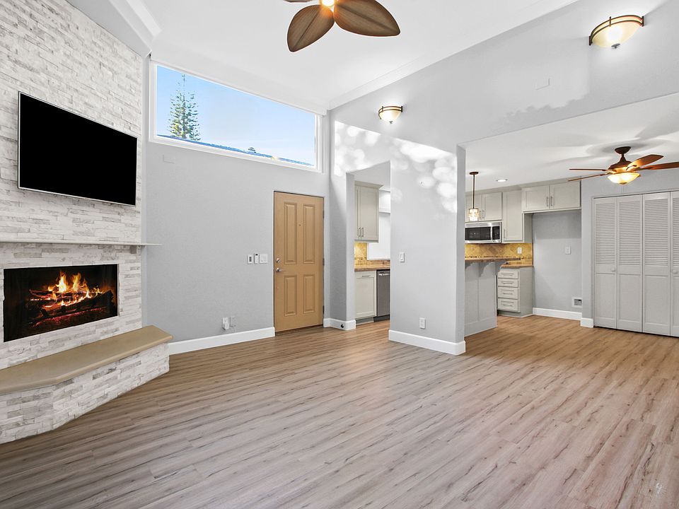 Welcome to this beautifully updated 4-bedroom, 2-bathroom townhome in the highly desirable Vista Del Oro neighborhood of San Pedro. Thoughtfully designed across multiple split levels, this residence blends modern upgrades with inviting spaces, ideal for both everyday living and entertaining. The remodeled kitchen is a true highlight, featuring sparkling stainless-steel appliances, including a high-end freestanding stove, dishwasher, and microwave, granite countertops, under-cabinet lighting, a breakfast bar with pendant lights, and a generous pantry for extra storage. The kitchen flows seamlessly into the dining area and living room, where custom remote-control blinds and a stunning floor-to-ceiling stone fireplace with a handcrafted mantel serve as the centerpiece. TV hookups above the mantel add convenience, while sliding glass doors open to a private shaded patio with direct access to a spacious yard area. The split-level layout offers flexibility and privacy. Just a few steps up, you'll find two well-sized bedrooms and a remodeled full bathroom with dual sinks. Another short flight leads to a spacious third bedroom with soaring ceilings, perfect for a guest room or an office. At the top, the expansive primary suite provides a true retreat with two walk-in closets, a nautical-inspired accent wall, and sliding glass doors leading to a large private balcony. The remodeled ensuite bathroom features dual sinks, a walk-in shower, and a separate soaking tub with TV hookups, creating a spa-like escape. Additional highlights include an attached two-car garage with 240v hookups for electric vehicles, an interior laundry room, and a recently upgraded electrical panel. The home also offers forced-air heating and air conditioning, dual-pane windows and sliding doors, high-end travertine and vinyl flooring, upscale lighting, ceiling fans throughout, and both hardwired internet and TV hookups in every room. Located in one of San Pedro's most sought-after neighborhoods, this townhome is just minutes from schools, parks, shopping, and the vibrant San Pedro waterfront. With its spacious layout, thoughtful upgrades, and prime location, this property presents a rare opportunity to enjoy modern comfort in the heart of Vista Del Oro.