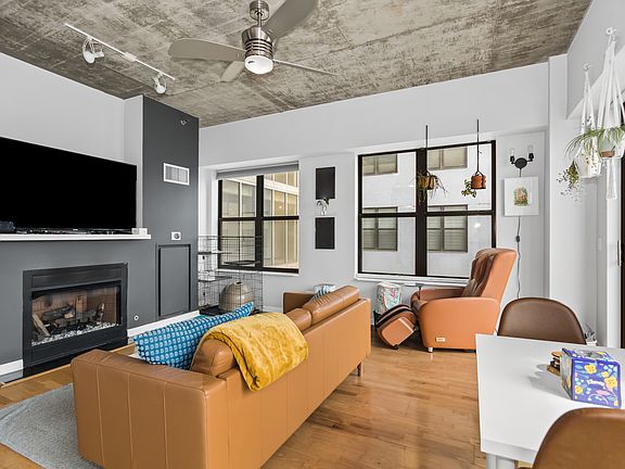 Experience elevated living in Edgewater's premier elevator building with this stunning high-floor corner unit offering breathtaking lake views. This spacious 2-bedroom, 2-bath concrete loft features soaring 10-foot ceilings, a cozy gas fireplace, in-unit washer and dryer, and a desirable split-bedroom floor plan that provides both privacy and functionality. The bright and airy open-concept kitchen and living room face east, filling the space with abundant natural light. The kitchen is equipped with sleek stainless steel appliances, while both generously sized bedrooms offer excellent closet space and comfort. Monthly assessments cover high-speed internet, heat, air conditioning, a deeded parking space in the heated attached garage (included in the price), and an additional storage cage. Residents enjoy access to top-tier building amenities including a fully equipped fitness center, party room, dog run, and a spacious common roof deck complete with a fire pit and panoramic lake views. Perfectly located just steps from vibrant Andersonville, beautiful beaches, the lakefront trail, the Red Line, shopping, dining, and more-this home offers the ideal blend of luxury, convenience, and community.