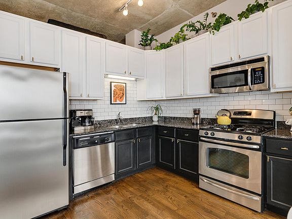 Edgewater Modern loft featuring Western Exposure with gorgeous sunsets views now available for move-in. Open floor-plan with soaring ceilings, proper foyer, and a Juliet balcony off the living room area. Modern kitchen with 42" white and black cabinets, brass cabinet handles, subway tile backsplash, granite, and stainless steel appliance package including stove, fridge, dishwasher, and undermount microwave.