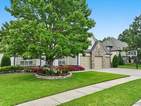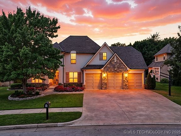Welcome to your luxurious retreat, perfectly situated at the crossroads of Bixby and South Tulsa, offering the ultimate in comfort and convenience. This beautifully updated residence features 5 spacious bedrooms, 4.5 baths, and a stunning grand foyer that opens to elegant formal spaces, including a formal dining/sitting room and a private office with its own closet. At the heart of the home is a chef's dream kitchen, designed to ignite culinary creativity. Outfitted with top-of-the-line Bosch appliances including double ovens and a built-in drawer microwave. This chefs kitchen is adorned with quartzite countertops, a Dolomitic Marble backsplash, and custom cabinetry extending to the ceiling with soft-close doors and drawers. A large STUNNING single-slab center island seats five, making it ideal for casual dining. Step outside to your private backyard oasis, featuring an in-ground pool, spa, firepit, and a fully equipped outdoor kitchen all set against the serene backdrop of a lush greenbelt. Gorgeous mature trees surround the home and are a focal point through the picturesque windows adorning the home. The luxurious primary suite offers a true escape, complete with a gas fireplace, all-new custom cabinetry, and elegant Dolomitic Marble finishes. The spa-inspired ensuite bath boasts a composite quartz stand-alone soaking tub, a curbless walk-in shower with multiple showerheads, and a heated quartzite