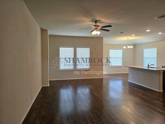 Lovely 3-bedroom home features an open living room/kitchen/dining area leading out to a covered patio. Kitchen island with bar seating, a deep stainless sink, and a dishwasher. Pantry storage and range/oven included. Master suite offers a dual-sink vanity, spacious shower, and a walk-in closet. Laundry room with hookups and central heating and air conditioning. Fenced backyard and two-car garage.