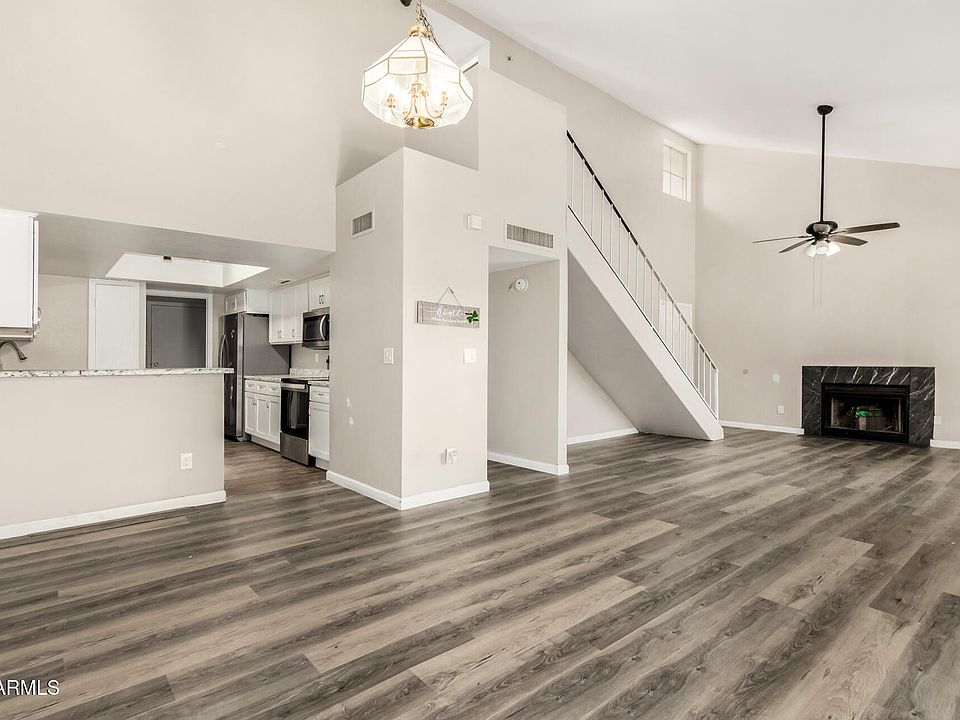 LOCATION, LOCATION, LOCATION! Near Peoria Elementary & High School, Historic Downtown Peoria, and just minutes to Westgate! The neighborhood fire department is right at the end of the block. This inviting two-story home offers great curb appeal and a convenient two-car garage. Inside features abundant natural light, high ceilings, open living areas with a cozy fireplace, and a bright kitchen with SS appliances, and a pantry. The main bedroom is downstairs with a private bath and walk-in closet. Upstairs bedrooms each have walk-in closets. Serene backyard with covered patio and play area. Priced to allow for your personal touch and TLC—amazing value for the area!