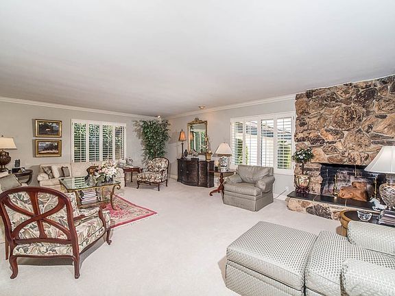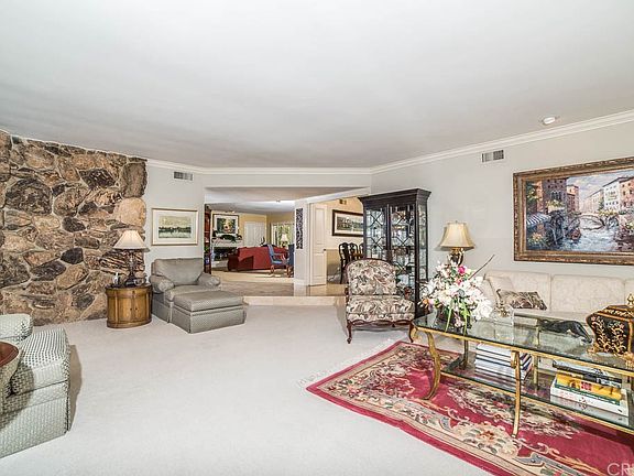 Fall in love with this immaculate home in desirable Old Granada Hills. This home sits up high on a knoll with a circular driveway accenting the well landscaped approach. The double door entry with leaded beveled glass opens into the bright, airy living space with numerous upgrades. Updated and remodeled this home features 2525 sqft with 4 br+2.5ba in a very well laid out floor plan. Formal entry leads to spacious step down living room with crown molding, plantation shutters and floor to ceiling fireplace with raised hearth. Kitchen remodeled with maple cabinets, granite counters, tumbled marble backsplash and stainless appliances including a subzero refrigerator, Dacor double oven, 6 burner gas range and Bosch Dishwasher, highlighted by a spacious breakfast area. Separate indoor laundry room with cabinetry. Built in wine rack. Plantation shutters, crown molding, raised panel doors and recessed lighting throughout. Inviting family room accented by wainscoting has the homes 2nd fireplace alongside a wet bar. Both bathrooms have been remodeled with marble counters, crisp white cabinetry and tile floors. Ample linen and storage throughout. The secondary bedrooms offer mirrored wardrobe and one with a walk in closet. Comfortable master suite has a large walk in closet and beautiful private bath. Outside you will find a brick lined covered patio with truly park-like grounds. This home has it all!