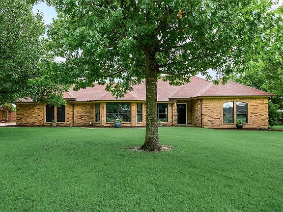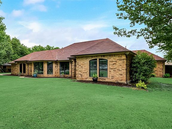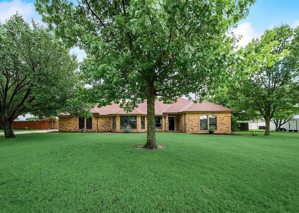 See this spacious 1 acre get-away located on the Southside of Forney, close to Forney High. Huge front yard with mature trees & over-sized drive. This single-story brick 4bed 2bath has great drive-up appeal. No HOA. Upon entrance you'll find an open floor-plan, tall ceilings, wood-look laminate & decorative fire place. The living area flows into open dining space adjacent to the GRAND eat-in kitchen with bar-top, granite counters & mobile island. Custom farmhouse features including ship-lap, barn door & trim! NEW CARPET in Master, BR2 & BR3. Spacious BR4 or flex space off of living area provides backyard access. Large covered back patio & MASSIVE back yard fully fenced. Minimal Restrictions & Great Schools!!!