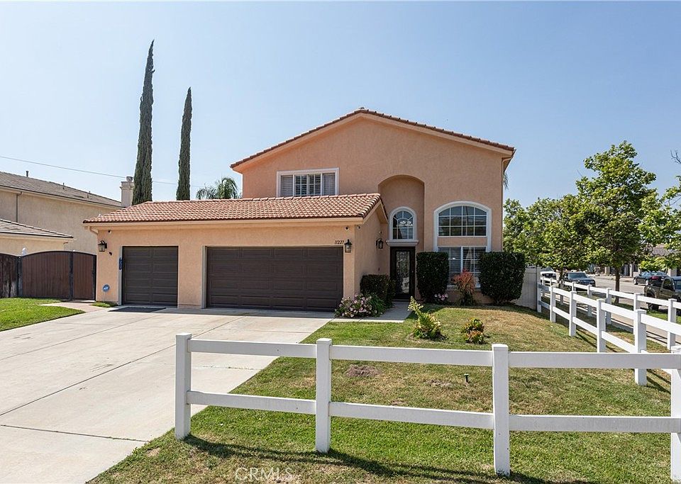This beautiful two-story home is a haven for discerning home buyers who love to entertain! Enter through the gorgeous front door adorned with etched glass & iron scrollwork into the breathtaking living room with soaring ceilings. The half-moon shaped windows flood this space with natural sunlight, while the upstairs landing with wrought-iron railing & ceramic tiled flooring throughout the main floor & a touch of sophistication. The kitchen includes stainless steel appliances, granite countertops with ample space for prepping food, ample cabinet space, & a peninsula. Adjacent to the kitchen, enjoy informal dining with views of the rear yard & entertain family & friends in the formal dining area. Overlooking the backyard is the cozy family room, highlighted by a wood framed fireplace & mantle, wet bar, & French doors that open to a pergola-covered patio. Rounding out the main floor’s floor plan is a bedroom & a full bathroom, perfect for guests to enjoy added privacy while visiting, for adult children or in-laws to live in full time, or as a flexible space for a home office. Ascending the grand staircase, you will find the expansive primary bedroom, complete with an en-suite bathroom featuring a dual sink vanity, shower, separate tub, & mirrored closets. The upstairs hallway bathroom, also with a dual sink vanity & shower tub, serves two additional bedrooms, each with mirrored closets. Paradise awaits in the private backyard, designed for entertaining, offering numerous areas to relax & mingle. Imagine summer days lounging by the sparkling pool & spa, enjoying meals prepared in your outdoor kitchen and bar, sharing stories around the fire, & savoring the tranquil sounds of the rock water feature. The pergola-covered patio creates an enchanting outdoor space.