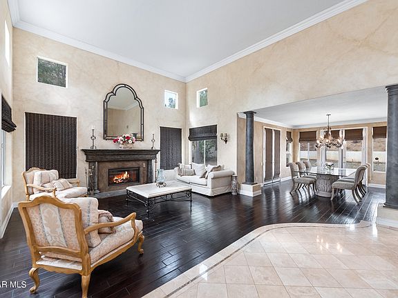 Fabulous South Moorpark Deauville home. This beautiful Mediterranean style 5-bedroom + 4.5 bath home has been upgraded and remodeled with a terrific designer chef's kitchen with a center island and breakfast nook. Large, over 4000 sq. ft. home features a dramatic entry with high cathedral ceilings and a spiral staircase. In addition to the formal living room with its impressive fireplace, the downstairs boasts a formal dining room, a separate family room and fireplace, wet bar, laundry room with sink and a downstairs bedroom with a full bath. The extra-large master suite includes a cozy fireplace, two walk-in closets and bathroom with separate shower and soaking tub. One of the upstairs bedrooms has an attached ensuite full bath and a Juliet balcony. The other two upstairs bedrooms share a jack & jill style bathroom. The large (over 11,000 sq. ft.) pie shaped lot has plenty of room for a pool. Attached 3-car, direct access garage has built-in storage. Community pool, spa and clubhouse. Close to shopping, schools, restaurants and more.