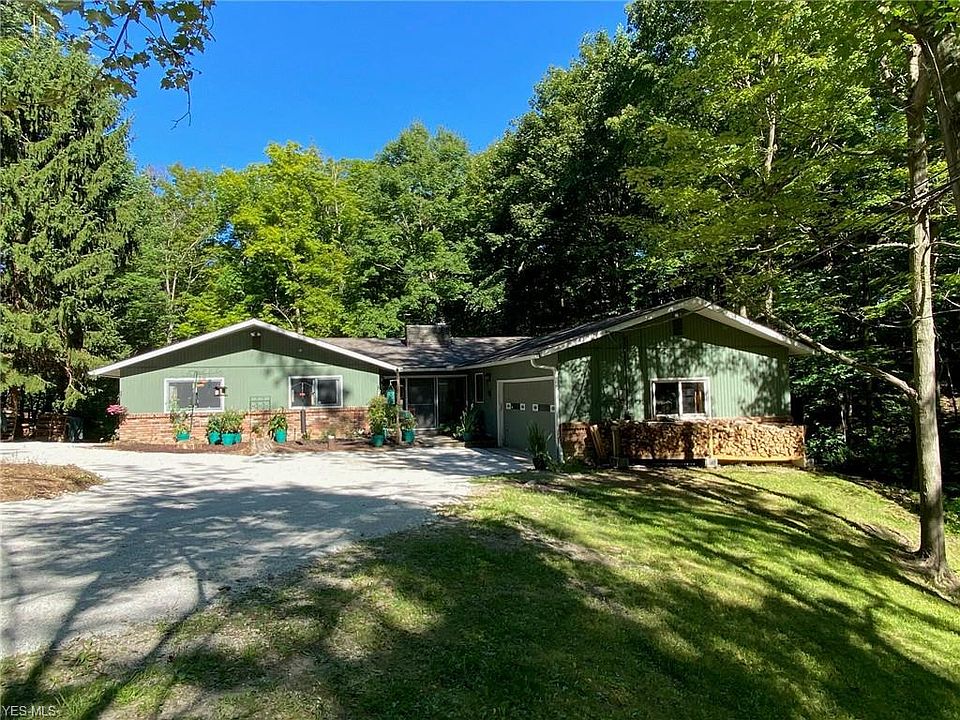 Enjoy one floor living and views of nature from every window of this Ranch nestled on 1.5 peaceful acres! This home offers great living space and includes 4 Bedrooms, 2 full Baths, Family Room, Dining Room open to spacious Living Room with stone fireplace and new wood burning insert. Beautifully remodeled Kitchen with all new cabinetry, Corian countertops, island with breakfast bar, fixtures, wood laminate flooring and high-end appliances. Master Bedroom with private bath. 1st floor laundry and partial walk-out basement. Major improvements since 2019 include: New furnace and central air with new duct work throughout, new electrical panel and updated lighting, new carpeting and flooring in many rooms, water softener/whole house filtration and new septic system. Set back off the road, this secluded property includes mature trees, large wood deck overlooking pond and stream with wildlife visiting daily. Property backs up to Orchard Hills Park with walking trails and sledding hill. Fresh gravel in circle driveway. 2-car attached garage. 1-yr home warranty. West Geauga Schools.