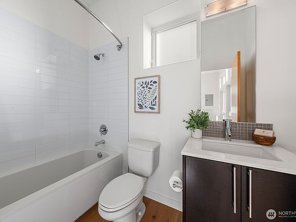 This modern, architecturally distinct stand-alone home has more than you thought you could hope for. Each space is bright and expansive. Unobstructed western views of the twinkling skyline and Olympics through walls of windows and from the breath taking roof deck. Every amenity is a delight. Each bedroom has an en-suite bath! Live in the heart of the city with remarkable spaces for entertaining. A first floor patio has easy gardens where every choice was well considered. The great room has living, kitchen, and dining that are connected yet distinct. The kitchen has recent premium appliances and a heart-of-the-home grand island. A new heat pump with AC gives year-round comfort. An attached garage, a walk score of 95, this is your happy home!