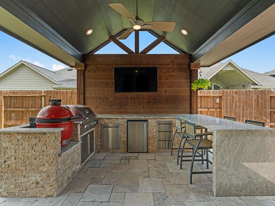 Outdoor kitchenGas grillWood floorsSpacious backyard retreatQuartz waterfall countertopsCovered patioThoughtfully designed layout