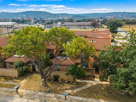 Located in the heart of Kerrville, this well-kept townhome offers outstanding convenience with quick access to shopping, restaurants, and medical services. Inside, you'll find a bright layout with two atrium-style patios that bring in natural light and create peaceful spots for relaxing or tending plants. The main living area features tall ceilings, a wood-burning fireplace, custom built-ins, and a wet bar perfectly placed for hosting or cocktails. A dining area connects to the updated kitchen with quality cabinetry, modern appliances, and a breakfast bar overlooking a flexible open space ideal for an office or second living lounge. The split bedroom design adds separation, and the primary suite includes a walk-in closet and patio access. A well-planned rear-entry garage features built-in cabinetry for ample storage. At the front of the home, a charming brick-walled courtyard creates an inviting open-air setting beneath a large shade tree, perfect for outdoor living or alfresco dining. HOA dues are $550/year and cover exterior watering, landscaping, garbage service, and common-area taxes. A rare find in this area... don't miss the chance to see how comfortably this home lives!