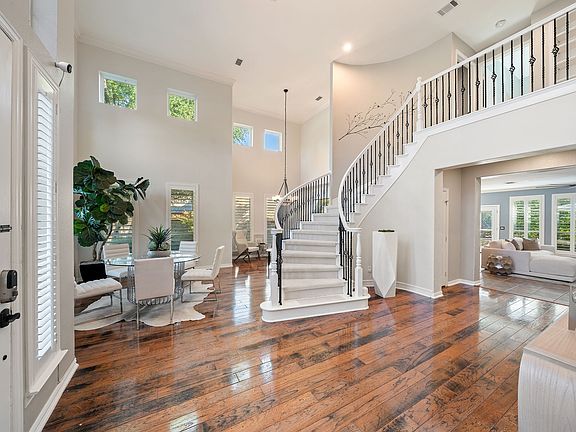 Captivating Curb Appeal with Timeless European Flair. This exquisitely remodeled home masterfully blends transitional-modern design with European elegance. A sophisticated German Schmear façade sets the tone, leading into a beautifully updated interior featuring rich wood flooring, a graceful iron spindle staircase, and Karastan luxury linen carpet. The open-concept kitchen is a true showpiece, featuring a GE Monogram professional gas range, custom vent hood, white cabinetry, and striking designer lighting. It seamlessly connects to the inviting family room, where a custom stone fireplace and built-in shelving create a warm focal point. All energy-star rated, double-pane windows were replaced (2022). A wall of windows, accented by Sunburst shutters, showcases breathtaking views of the lush greenbelt and the stunning heated pool-spa oasis, remodeled with travertine and a custom built firepit, perfect for entertaining. The luxurious primary suite offers a fireplace, sitting area, and a custom spa-like bath with a freestanding tub, curbless shower, luxury system, and custom glass. Thoughtfully considered details include low-maintenance astro turf, an epoxy-finished, climate-controlled garage, and a Rachio smart irrigation system. The first-floor home office features built-ins, and charming bookcases are found throughout the home; the office can also convert to an optional guest suite. Nestled on an oversized lot against a tranquil greenbelt, this highly desirable North-facing residence offers refined, move-in-ready living. Health-focused updates include Air Scrubbers by Aerus installed into both HVAC systems to remove contaminants (VOCs, dust, allergens). The home also encompasses three additional 2nd floor bedrooms and a media room. Located in the Allen ISD. Twin Creeks community offers a premier lifestyle: Arnold Palmer designed golf course, miles of hiking & biking trails, two amenity centers with pools, playgrounds, and sports courts (tennis, pickleball).