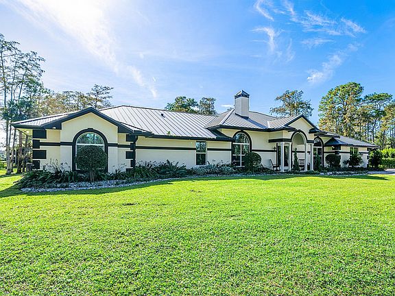 Experience privacy on 5 acres in the Homeland equestrian community. This home sits behind a gated, tree-lined driveway with lush landscaping and a newly upgraded front gate. Upgrades include a 2018 metal roof, impact doors and windows, a concrete safe room, poured driveway, travertine walkways, and all bathrooms redone with marble countertops. The master suite and closet were redesigned, plus a connected mother-in-law suite. Wood-look tile, volume ceilings, crown molding, and a renovated kitchen with granite and stainless appliances. Outdoor kitchen, resurfaced pool, hard-wired cameras, RO water, blinds, fixtures. Par-3 golf hole with stadium lighting and misting fans, commercial playground enhance your private outdoor amenities. Separate two-story garage for all your toys.
