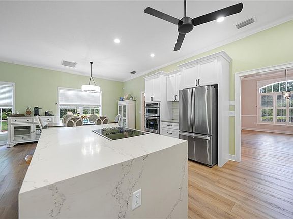 You will LOVE this gorgeous custom built home on an acre of land. As you enter the long driveway you will immediately notice the lush landscaping with mature oak trees, fruit trees and a sprinkler system to help maintain the beauty of this yard. As you make your way to the grand entrance you will notice a formal Dining room, separate Living room and beautiful luxury vinyl flooring. The kitchen is a chef's dream as it was just recently updated with stunning quartz countertops with a waterfall edge off of the center island, lovely white cabinetry and all stainless Steel appliances. While cooking you can still entertain guests as it overlooks the eating area and family room. Upon entering the LARGE Primary bedroom, you will fall in love with the beautiful En Suite as it has gorgeous travertine tile, large walk in shower, garden tub and his & her sinks. This lovely home also features 2 large guest bedrooms, a guest bathroom, 1/2 bath and best of all Large inside laundry room. Newer features of the home include flooing, kitchen, A/C, roof 2019 and solar in 2021 (paid for) and Septic recently pumped and inspected. This home truly is one of a kind with crown molding, trey ceiling, High ceilings and so much more! Be sure to see the video and tour that is attached to this listing.