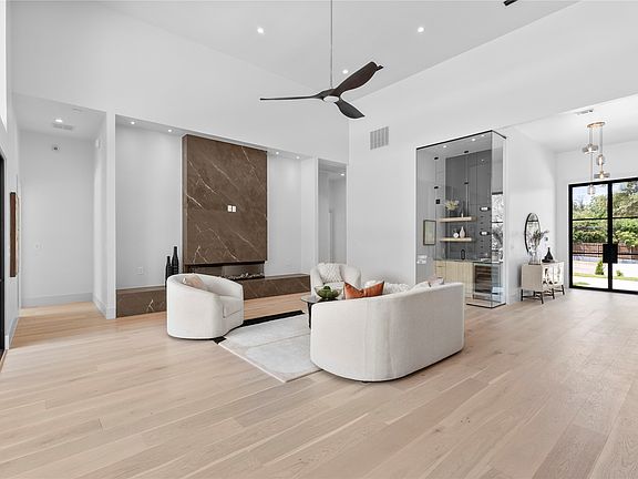 The open concept layout and soaring ceilings bathe the interiors in natural light, offering sweeping views of the resort style pool and manicured grounds. The impressive kitchen features a spacious eat-around center island, glass enclosed wine display, 48 inch Thermador gas range, and built in 60 inch Thermador refrigerator. The adjoining great room, anchored by a modern fireplace and multi slide glass doors, flows seamlessly into the dining area and outdoor living spaces.