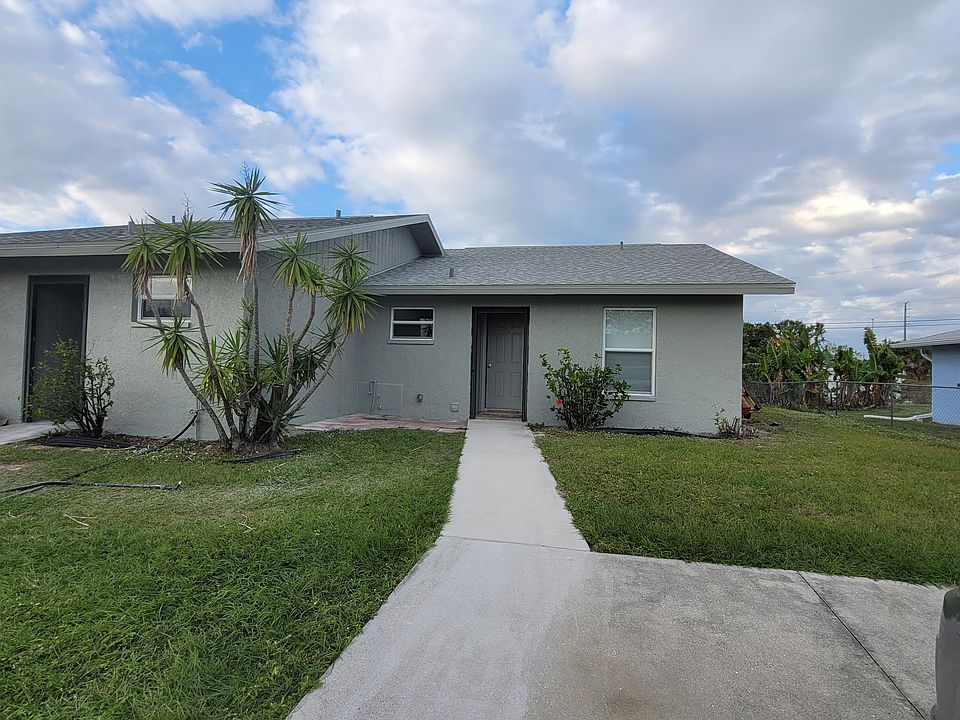 Newly remodeled 2 BR/ 2 BA duplex with new kitchen and baths. Tile floors throughout. Ceiling fans in living room and bedrooms. Screened lanai for relaxing, fully fenced backyard space for privacy. Laundry hookups for washer and dryer. Private driveway for off-street parking. Pets are welcome.