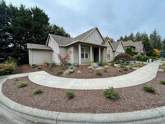 Just off the great room is your dining area and kitchen. Your new gourmet kitchen is fabulous with custom light hickory-colored wood cabinets, beautiful granite counters, and a large island with additional storage. Your new home has a refrigerator, dishwasher, stove/oven and a built in cabinet microwave. The recessed lighting and french doors off the dining area provide additional great lighting. A large covered patio is just outside the french doors offering you an outdoor living area with shelter from the PNW climate. Access your mudroom/laundry area just off the kitchen.