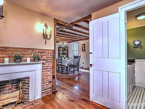This early-1800s farmhouse is the real deal, with wide plank hardwood floors, exposed beams, and original details that simply can't be replicated. The original front door has been restored and sets the tone the moment you arrive. And wait until you see the fireplaces, while only one is functioning; the additional 3 add character to this truly one-of-a-kind home. The first floor offers generous living space with two entry foyers, a formal living room with an ornamental fireplace, and a dining room that truly serves as the heart of the home, featuring a fireplace with pellet stove. Off the dining room is a charming sitting room, or office or quiet reading space. The kitchen blends old-world charm with modern convenience, with granite counters, SS appliances, a sunny breakfast nook, and a tucked-away laundry room. A rare first-floor primary bedroom with a walk-in closet adds everyday ease to this antique gem. Upstairs, two bedrooms share a beautifully updated full bath. Outside, 1.47 private acres frame a classic New England setting with a stone wall along the front of the property, a covered porch, and a detached two-car garage. Thoughtful exterior improvements include refreshed landscaping, garden spaces, a rear pond feature, and 6 new windows. Cooling is provided by mini-split systems in the bedrooms; the rest of the home stays true to its roots. This isn't a cookie-cutter house. It's a piece of history with quirks, character, and a story you'll be proud to continue.
