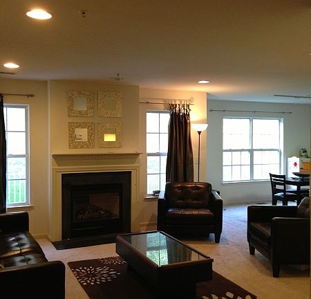 Multi floor townhouse. Carpeted flooring with a gas fireplace in the living room. 1st Level: Family room2nd Level: Open floor plan with dining room, foyer, kitchen, living room, pantry, and powder room.3rd Level: 2 BR, 2 baths, and laudry roomAvailable 12/1/13