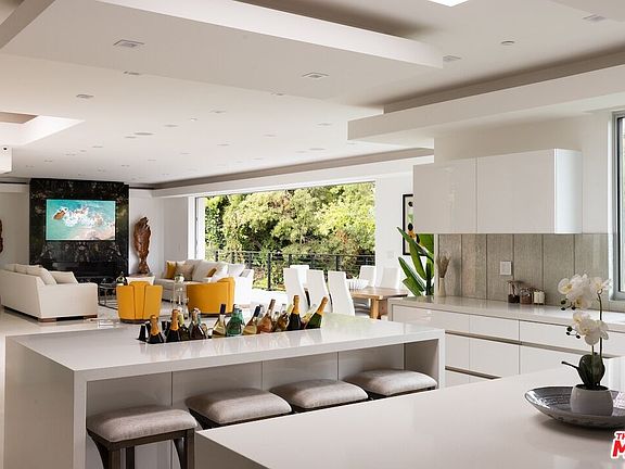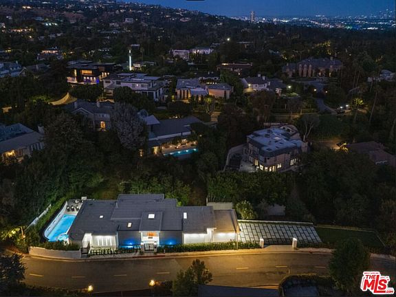 Set behind gates on a premier and prestigious Beverly Hills street (Beverly Hills proper - not BHPO), all on one single level, this newly rebuilt smart home seamlessly blends cutting-edge technology with refined modern luxury. Greeted by approximately 175 feet of frontage and impressive curb appeal, the residence invites you across floating steps above a serene reflecting pool, where a custom-designed pivot door unveils bold, sophisticated modern architecture. Inside, expansive floor to ceiling Fleetwood pocket doors disappear to reveal curated greenery and treetop vistas while creating a fluid indoor-outdoor living experience. Gleaming porcelain floors and tray ceilings add volume and sophistication to the open-concept layout. The living room centers around a dramatic, floor-to-ceiling bookmatched slab fireplace. Multiple Primary bedrooms with ensuite bathroom designs, large walk-in closets and floor to ceiling Fleetwood pocket doors leading to a magnificent resort style pool & spa experience. The showpiece kitchen is a chef's dream; complete with two separate islands, one prep island, and one buffet/breakfast bar with recessed countertop beverage chiller, sleek custom European designed cabinetry, Miele appliances including steam and speed ovens, two separate gas and induction cooktops, a built-in Meile espresso machine, two separate Bosch dishwashers and professional-grade Sub Zero Column refrigerator & freezer units. Entertaining is effortless with a nearby bar featuring a dual-zone beverage cooler and a striking floor-to-ceiling glass climate controlled wine cellar that's as artful as it is functional. Smart home integration offers seamless control over lighting, sound, security, and climate, enhancing both convenience and ambiance. Outside, enjoy multiple viewing decks, serene lounging spaces, a sparkling pool and spa, lush flat grassy yard and a generous motor court round out the grounds of this entertainer's haven. Just moments from Sunset Boulevard, Rodeo Drive, world-class dining, and premier Beverly Hills amenities with access to top-rated public schools, world renowned police and fire departments; this estate offers a lifestyle of effortless elegance, innovation, and distinction.