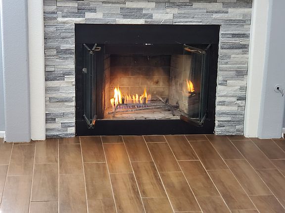 Ceramic tile plank flooring downstairs, newer carpet upstairs. Dark wood kitchen cabinets. Appliances include stove, wall mounted microwave, refrigerator, dishwasher...all stainless steel and looking great! Beautifully upgraded kitchen countertops with stainless steel sink and industrial look faucet. Beautiful stonework on wood burning, gas fireplace. Designer color gray paint. Contemporary light fixtures. Newer designer light switches and wall receptacles. Cordless blinds. Upgraded vanities in each bathroom with designer faucets. Mirrored closet doors in all bedrooms. Ceiling fans with remotes in all bedrooms. Master Bathroom spa to die for featuring separate tub and shower. Rain fixture shower. Large format marble look ceramic tile tub surround with ultra-modern waterfall Roman tub fixtures. Simply the best of the best you won't find another rental home like it... luxurious living at its finest!